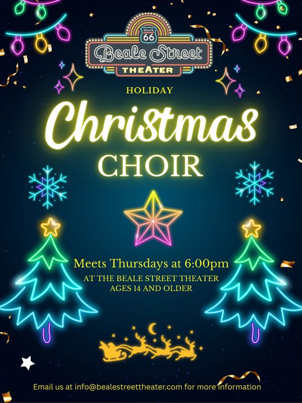 The Beale Street Theater Performance Choir is a community choir that meets occasionally throughout the year to prepare community programs and sing together. It is an open participation choir. If you would like to join us, email us at info@bealestreettheater.com. Performance dates are November 28 and 29, 2025